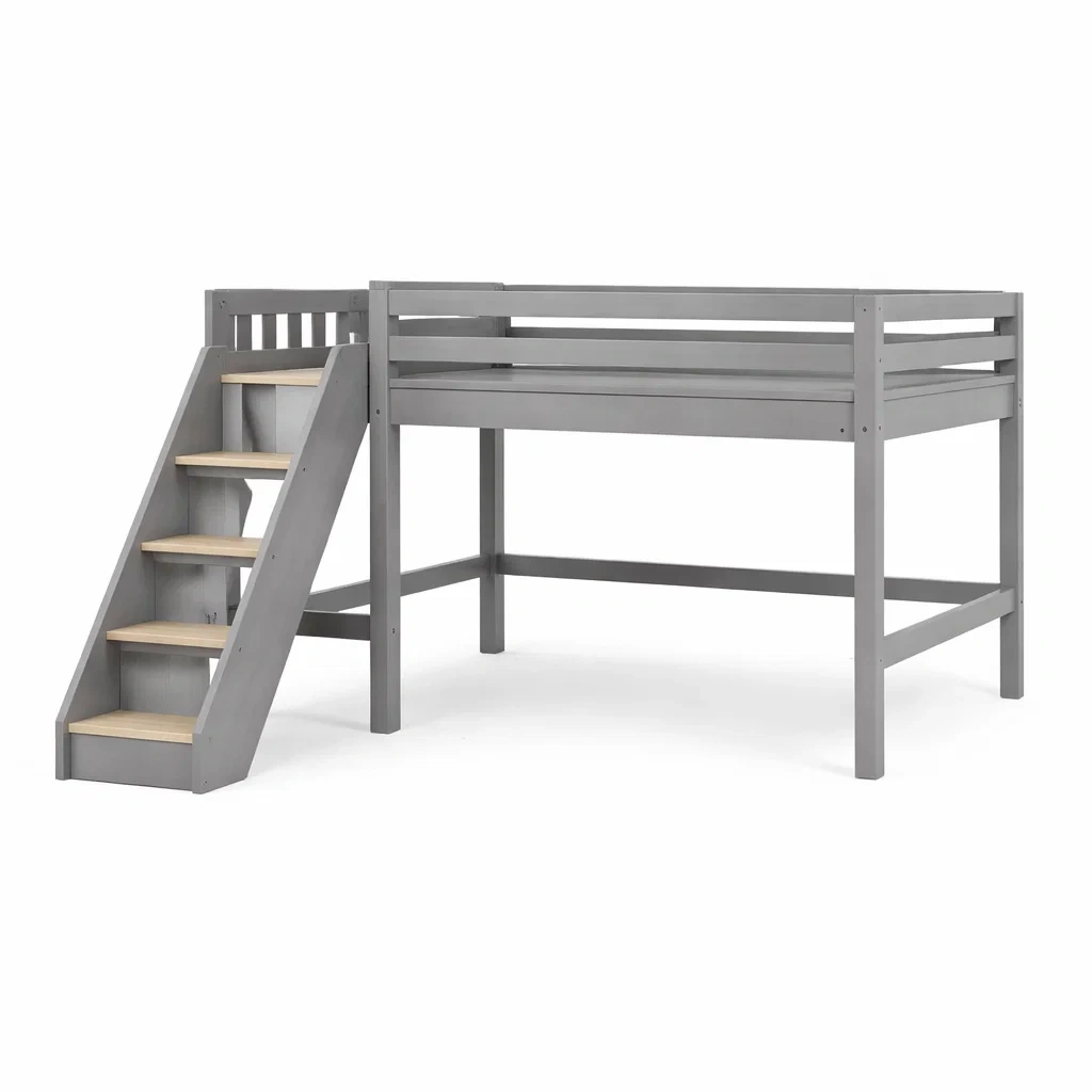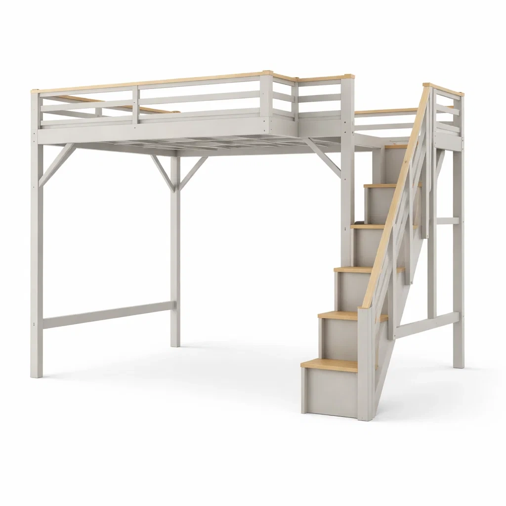 Lit mezzanine en bois de pin avec escalier gris et blanc 198x142x180 cm