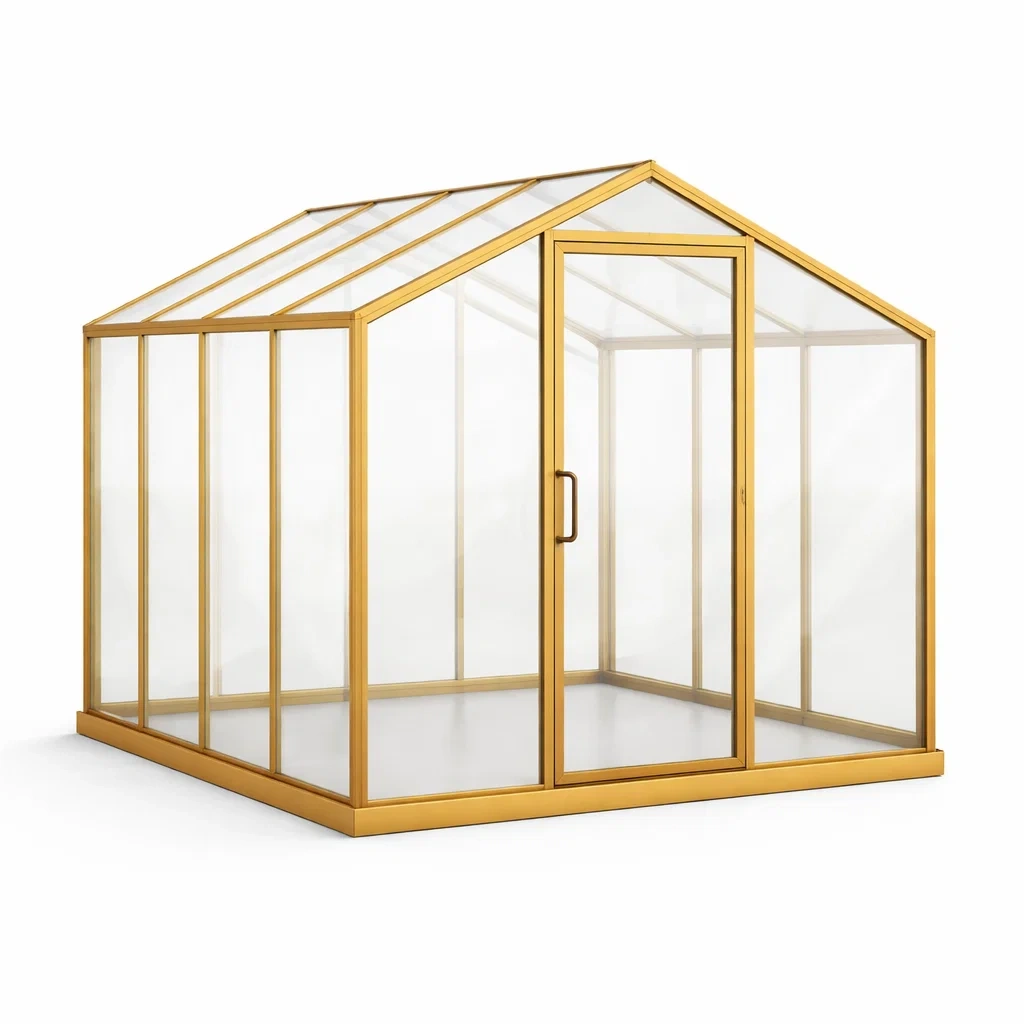 La serre est fabriquée avec un cadre en aluminium et des panneaux en polycarbonate, offrant une résistance robuste aux intempéries. Ses dimensions sont de 300 cm de longueur, 250 cm de largeur, et 200 cm de hauteur, couvrant une surface totale de 7.5 m². La structure présente une finition laquée dorée.